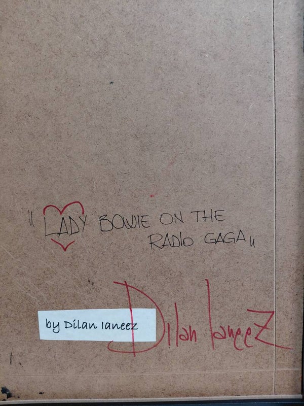 Sulla superficie di questa tela, il pennello dell'artista ha tracciato un sentiero di pura energia. Il volto di Lady Gaga si fonde con l'estetica siderale dello Starman, dando vita a una creatura mitologica del pop che abita lo spazio tra il sogno e la realtà. Ogni pennellata è un battito cardiaco, ogni sfumatura è un accordo elettrico che risuona delle note di Radio Ga Ga, celebrando il potere eterno della musica di trasformare l'identità.