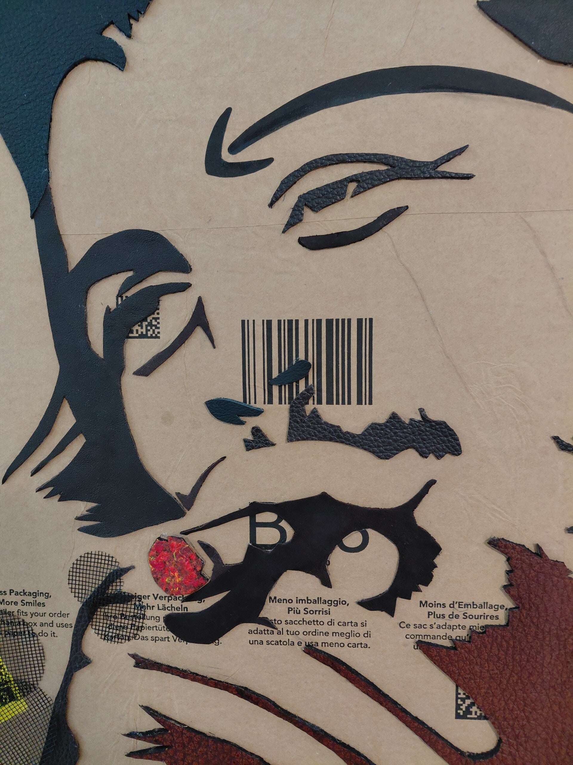 Attraverso un sapiente mosaico di pellami e pigmenti, l’opera si fa carne: ogni trama e colore racconta come i mutamenti del presente si stiano consumando, inesorabilmente, sulla nostra pelle. Il quadro è un labirinto di aneddoti e simbolismi sottili, dove il dettaglio diventa manifesto.