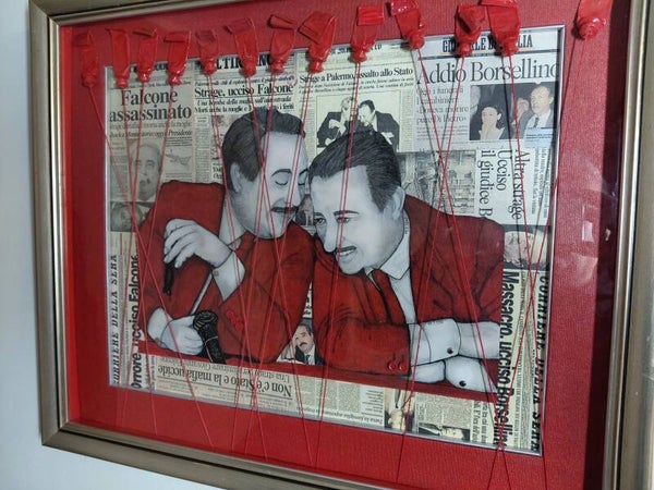 Quest’opera si presenta come un potente intreccio di memoria, denuncia e simbolismo. Al centro della composizione emergono le figure dei Giudici Giovanni Falcone e Paolo Borsellino, ritratte nell'iconico momento di complicità e dialogo, immerse in un’atmosfera sospesa tra intimità e tragedia. Il loro abbigliamento, dominato da un rosso intenso, richiama immediatamente il tema del sacrificio e della violenza, trasformando il colore in un elemento narrativo centrale.