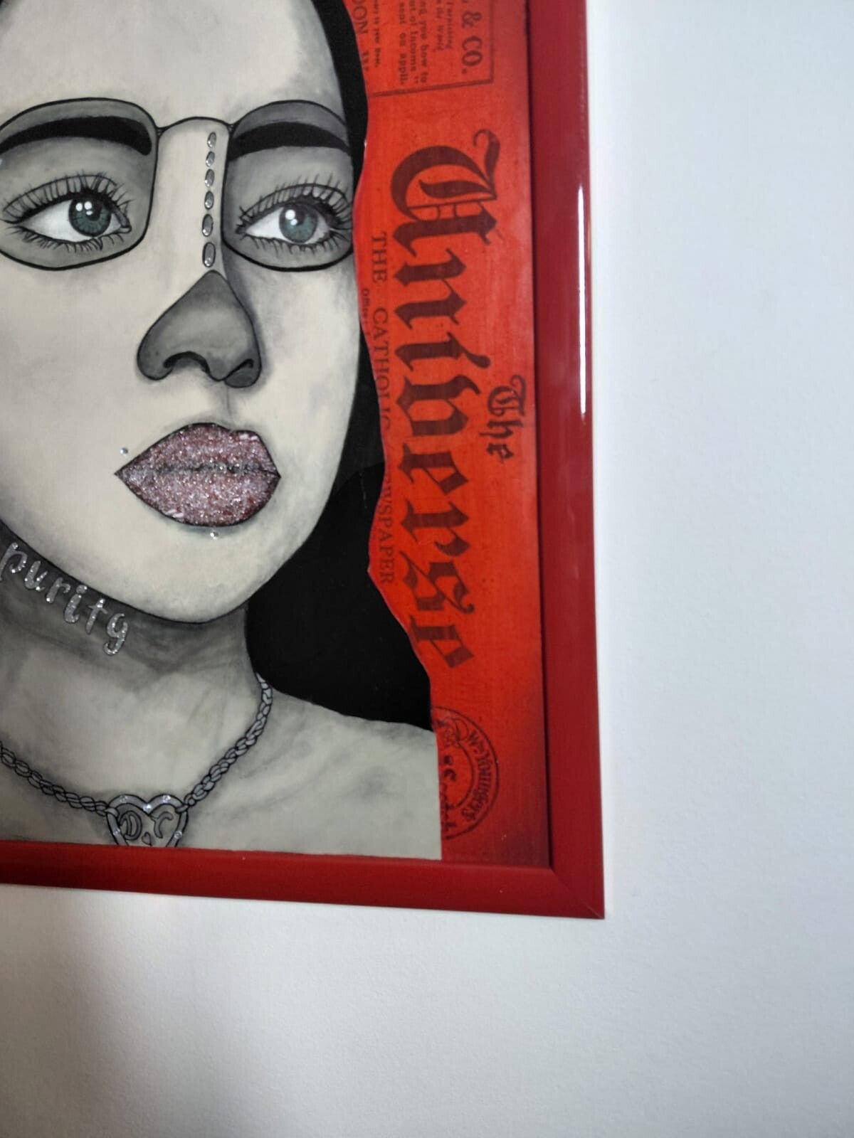 Sullo sfondo, la realtà si sgretola in un collage di giornali cattolici e cristiani. Titoli su fede, famiglia e preghiera creano una gabbia di carta che la circonda. Il contrasto è violento: il bianco e nero dei caratteri tipografici religiosi preme contro il colore livido della sua pelle tatuata. È il rumore del mondo esterno — un coro di precetti e dogmi — che tenta di sovrastare la musica solitaria che le risuona dentro la testa.